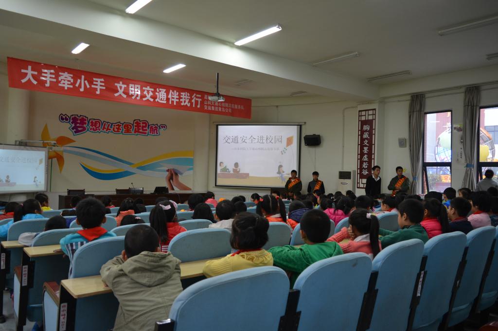 为普及交通安全知识,增强小学生的交通安全意识,提高学生在突发情况下的自救、互救能力,11月19日,bv伟德国际体育官方网站通心相随志愿服务队联合交运集团黄岛分公司在嘉陵江路第一小学成功举办了主题为“大手牵小手,文明交通伴我行”的交通安全知识宣讲活动。通心相随志愿者徐建和交运集团教导员担任主讲,志愿者舒腾担任主持。通心相随志愿服务队队长郑云辉、副队长彭天祥及队员、交运集团黄岛公司工作人员和嘉陵江路第一小学100余名师生参加了了本次活动。