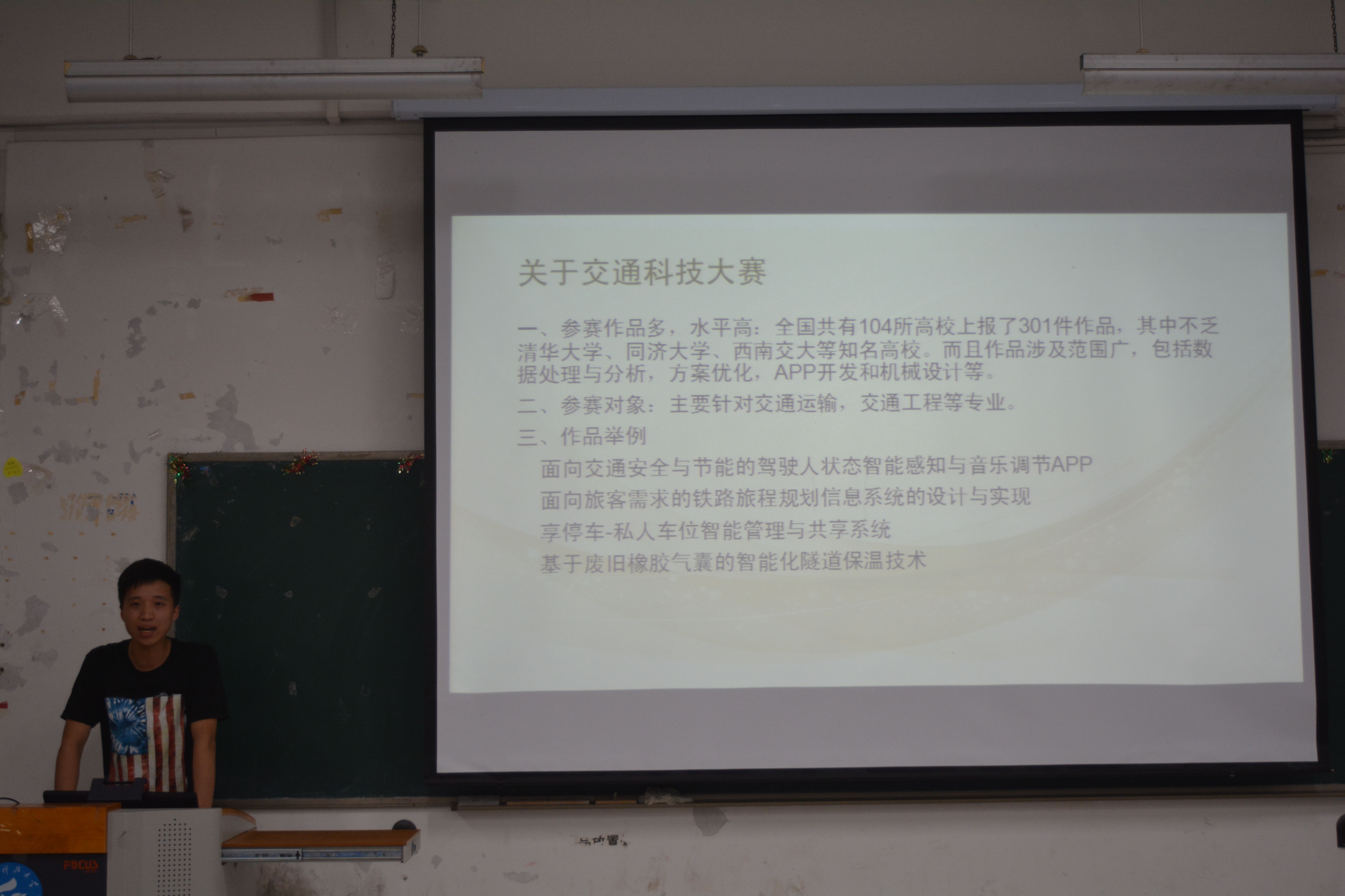 会上,宋洪干就如何制作三维模型仿真动画、作品PPT介绍,撰写作品说明书等方面的注意事项和创新点做了详细介绍,他强调,新颖的想法和合理设计方案是作品的灵魂,应全面思考、不断完善。刘富远结合自身参赛经历,以独到的眼光重点向大家介绍了交通科技大赛的赛前准备、大赛选题,作品建模等方面的问题,并通过展示交通科技大赛的优秀参赛作品,拓宽队员们的视野和思维。