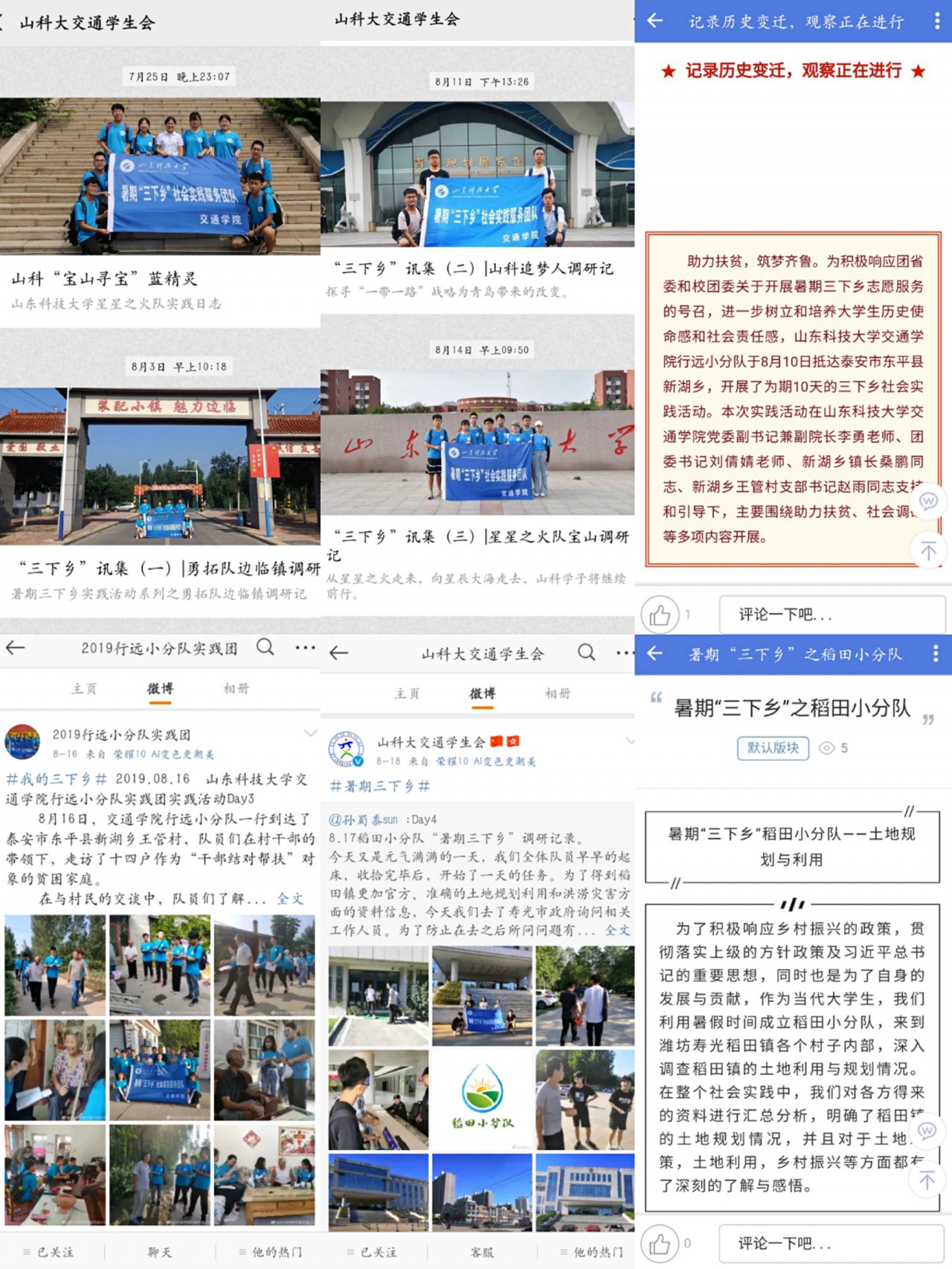 为深入学习贯彻习近平新时代中国特色社会主义思想,引领教育青年学生勇做担当民族复兴大任的时代新人,7月中旬至8月底,交通学院积极开展暑期“三下乡”社会实践活动。此次活动学院共组建包括行远小分队、星星之火小分队在内的9支重点团队,实践范围包括青岛、泰安、潍坊、德州等多个地区。
