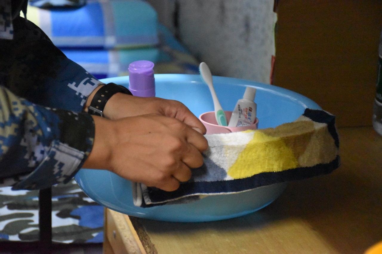 下午三点,教官们深入新生寝室,检查并指导同学们整理内务。走进宿舍后,教官对新生宿舍的卫生、整洁情况等作出了整体评价,提出了物品摆放要求以及床铺整理标准:个人物品要摆放统一、整齐;书架上纸质单、书籍应依次排开;寝室卫生需打扫得干净、清爽。