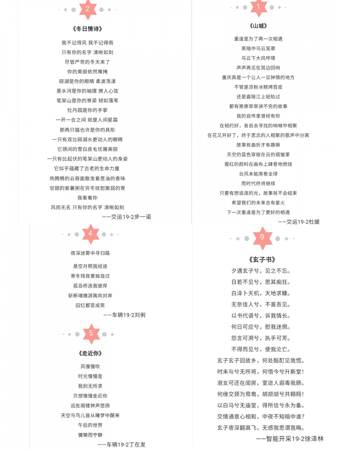 大赛期间,来自各个学院的选手们积极参加,涌现出诸多优秀的散文诗歌作品。其中,杜媛的作品《山城》以动人的笔触讲述了以重庆为背景的相遇与重逢,字里行间充斥着作者对故友重逢的憧憬以及对未来生活的美好向往,引人深思,耐人寻味;步一诺的一首《冬日情诗》采用了虚实相间的手法,将柔波荡漾的砚湖、韧如蒲苇的笔架山等校园景物拟人化,彰显着作者对科大真挚而又浓郁的热爱;张智超的《国家危难时,青春勇担当》饱含对战“疫”前线战士的钦佩,感人至深……选手们站在不同角度,以隽永的文字纷纷表达着内心的情感,阐述着对“美”的理解。