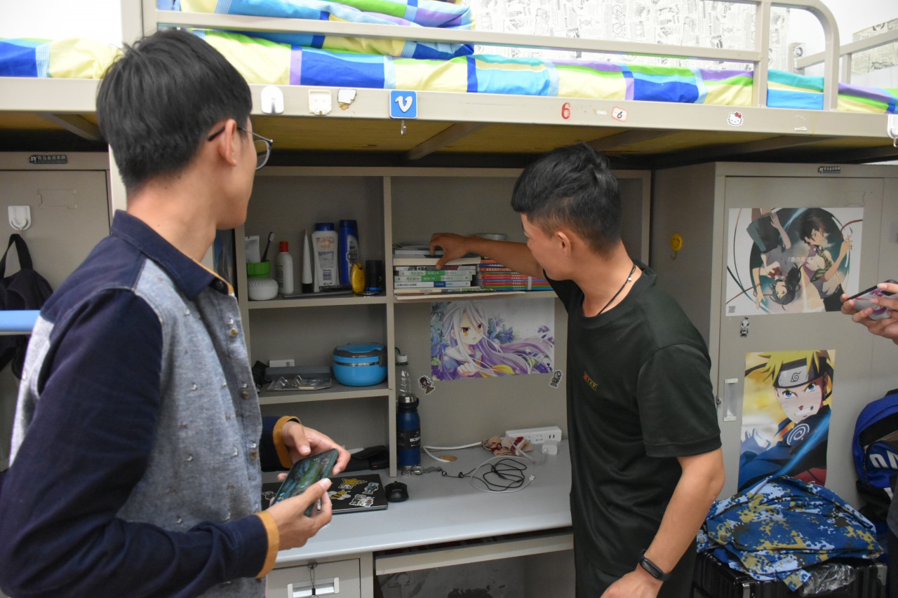 教官对新生宿舍被子的折叠、床铺整理、生活用品的规范摆放、宿舍清洁卫生等提出了严格要求,如“被子放在床上的位置要统一”、“鞋子要放整齐且摆放朝向一致”、“书桌干净整洁,学习用品摆放整齐”“地面清洁,不能留卫生死角”等细节标准。为指导同学们如何将被子叠成“豆腐块”,教官从被子的对折尺寸、折叠手法、掏平压实和如何叠出棱角等方面做了详细的示范和讲解。教官的每一个动作都干净利索,几分钟内就把松软的被子叠得有棱有角,博得了同学们的阵阵掌声。教官示范后,同学们跃跃欲试,纷纷开始整理宿舍内务。