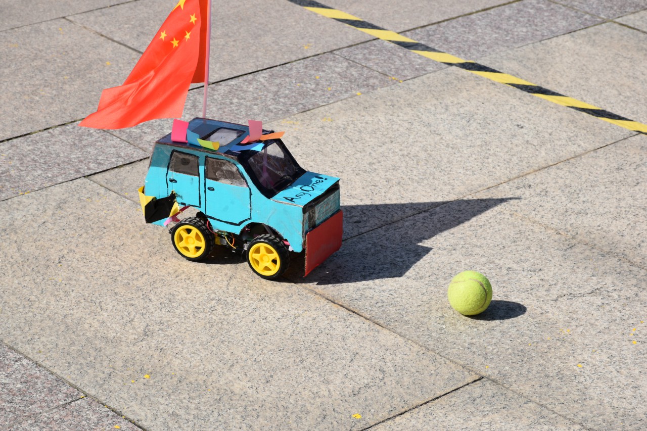 本次比赛共分两个环节,分别为外观比拼和足球大赛。其中足球大赛又分为初赛和决赛。首先进行的是外观比拼,由各位评委对参赛选手的智能车外观进行投票,得票最高者获得最佳创意奖。足球大赛赛前,选手们一丝不苟地调试智能车,以使其发挥出最好的水平。随着比赛的开始选手们稳稳地操控智能车,灵巧绕过各种障碍物,将球推入对方球门。选手们团结合作,迅速行动,及时调整战略,激烈的比拼引起现场爆发出雷鸣般的掌声,赛场上充盈着热情洋溢的青春气息。中场休息时间,大学生艺术团苏郭鑫、李楠茜的艺术表演将气氛推向了另一个高潮。